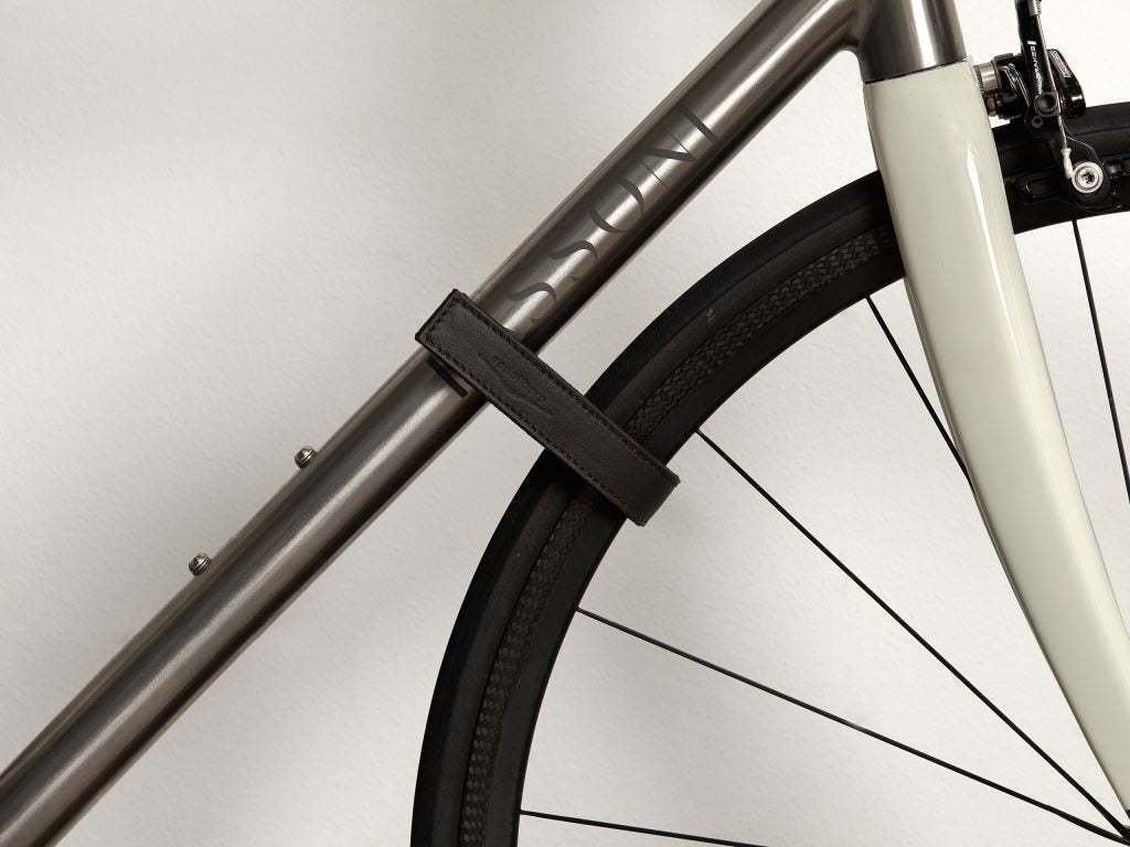 Depending on the frame geometries, when you hang your bicycle on a support the front wheel tends to turn around. If you are a perfectionist and you want to keep it perfectly straight when you park it on Bike Safe, our precious leather wheel strapis the solution.