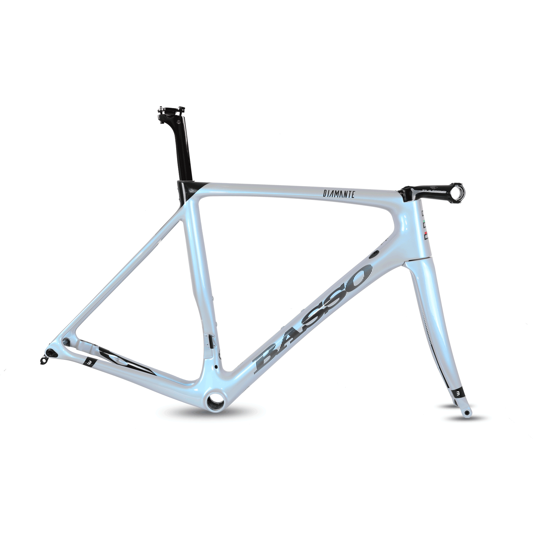 We have updated the tubing shapes, improved the materials and further developed the technology. In this new model design and R&D meet in the rounded tubing that allow an increase in performance. Bottom bracket flex is now 0.2mm and head tube tortion 0.4 mm, a 50% improved performance on the previous Diamante model. We have updated the tire clearance to 28 mm and brought the newly developed "3B seat clamp system" from the Diamante SV. Frame kit includes seat post, stem, three Basso carbon spacers and the new 10 mm Diamante spacer. Diamante is now available with Disk brakes or direct mount rim brakes and in five exclsive and proprietary colors: Lunar Blue, Rubin Red, Italia, Selenite Gray and Electric Sky.