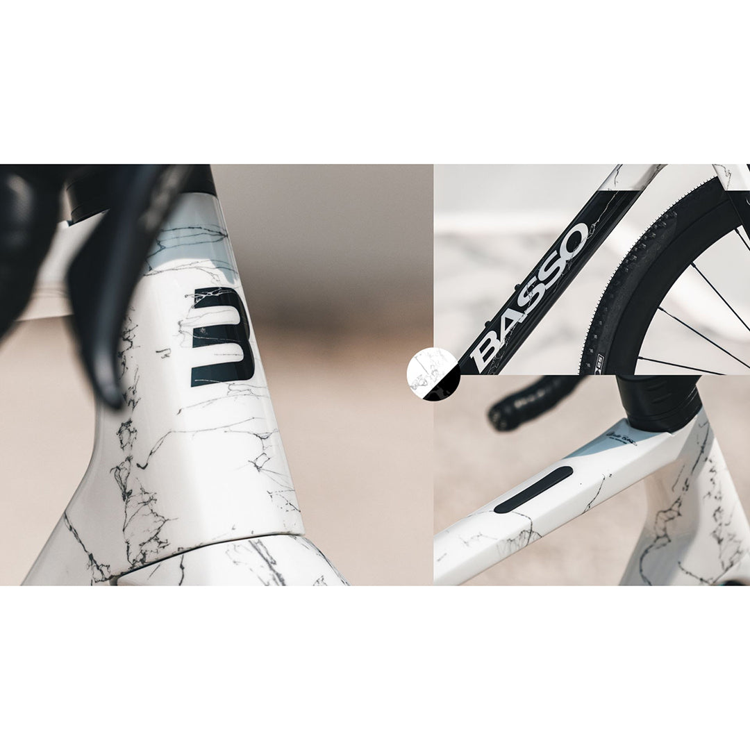 This celebratory color scheme draws inspiration from one of Veneto's most evocative cultural materials: marble. It pays tribute to the sculptures of Antonio Canova and Palladian architecture, adding a marbled effect to the glossy black and white livery of the new Palta. This unique bicycle further cements the connection between our region and the sport we love, aiming to contribute to the growth of the discipline.