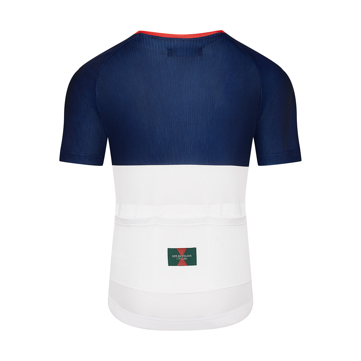 The jersey has a reinforced pocket structure with three rear cargo pockets and signature bleu, blanc et rouge colouring.